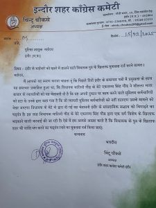 शहर कांग्रेस अध्यक्ष चिंटू चौकसे के नेतृत्व में कांग्रेस के प्रमुख नेता और कार्यकर्ता आज पुलिस आयुक्त कार्यालय पर पहुंचे। उनके द्वारा पुलिस आयुक्त कार्यालय पर प्रदर्शन करते हुए भाजपा की विधायक के बेटे एकलव्य सिंह गौड़ के खिलाफ आपराधिक प्रकरण दर्ज करने की मांग की गई। कांग्रेस के नेताओं ने कहा कि विधायक के बेटे के द्वारा शीतला माता बाजार के व्यापारियों को मुस्लिम कर्मचारियों को नौकरी से निकालने की धमकी दी गई है। इस तरह के कृत्य से शहर के नागरिकों में मौजूद भाईचारे की भावना समाप्त होती है। हमारा देश अमन और भाई चारे का देश है और सब यहाँ प्यार और एकता के साथ तेवहार मनाते है .