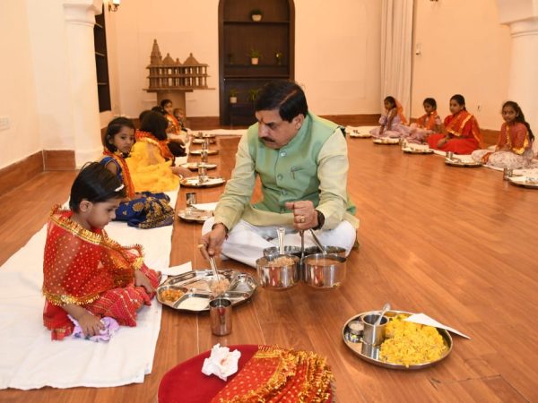 भोपाल। मुख्यमंत्री डॉ. मोहन यादव ने शारदीय नवरात्र की महानवमी पर बुधवार को मुख्यमंत्री निवास में कन्या-पूजन कर भोजन कराया। मुख्यमंत्री डॉ. यादव ने कन्याओं का तिलक कर पांव पखारे। उन्होंने कन्याओं को चुनरी ओढ़ाकर आरती की। मुख्यमंत्री डॉ. यादव ने कन्याओं से संवाद कर उन्हें दुलार भी किया।