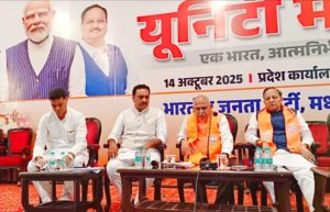 भारतीय जनता पार्टी सरदार वल्लभभाई पटेल की 150 वी जयंती के अवसर पर देशभर में यूनिटी मार्च आयोजित करने जा रही है। इस बड़े कार्यक्रम की तैयारियों को लेकर आज भाजपा कार्यालय में विशेष कार्यशाला संपन्न हुई। इस कार्यशाला में राष्ट्रीय महामंत्री अरुण सिंह प्रदेश अध्यक्ष हेमंत खंडेलवाल सहित अन्य वरिष्ठ भाजपा नेता मौजूद रहे।